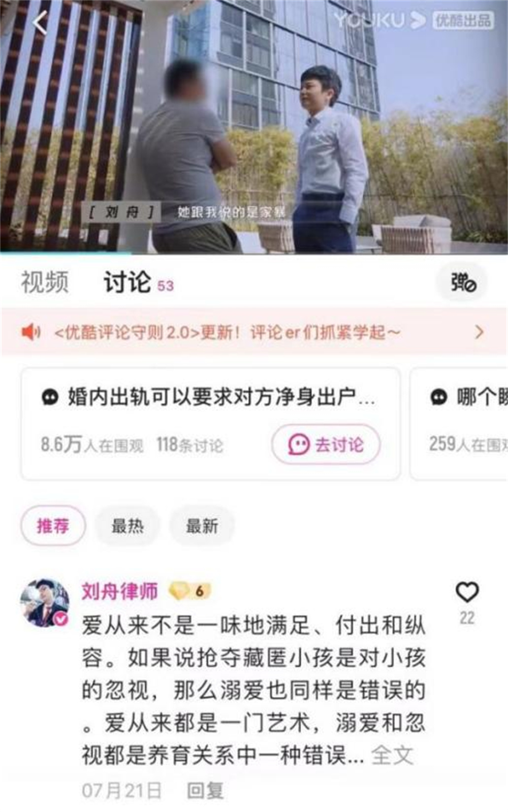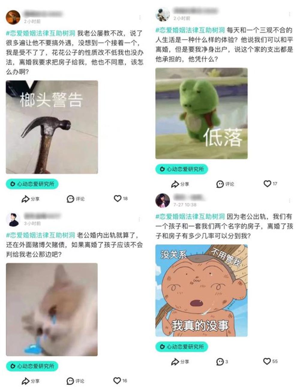 另外,平台方希望在纪录片之外为用户提供更大的讨论空间,为此,开通了树洞社区并联系多方律师机构为有需求的用户提供法律援助。在由《亲爱的敌人》纪录片引发的网络社群中,每天都有关于婚姻的困惑。截至7月30日,#恋爱婚姻法律互助树洞#的互动数达到了7951条。优酷纪录片也将邀请律师就大家的通识性问题,给出专业的法律意见。