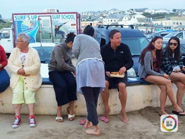 “无官一身轻”的卡梅伦手捧一盒炸鱼薯条,穿着沙滩裤,坐在人群中有滋有味地吃着。