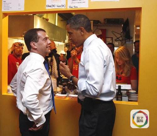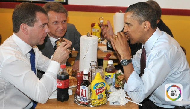 2010年奥巴马与到访的时任俄罗斯总统梅德韦杰夫会面,就邀请他一起在快餐店吃汉堡薯条。