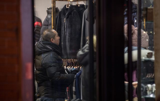 阿里巴巴打假特战队员正在哈尔滨一家服装店铺内寻找涉嫌假冒的服装