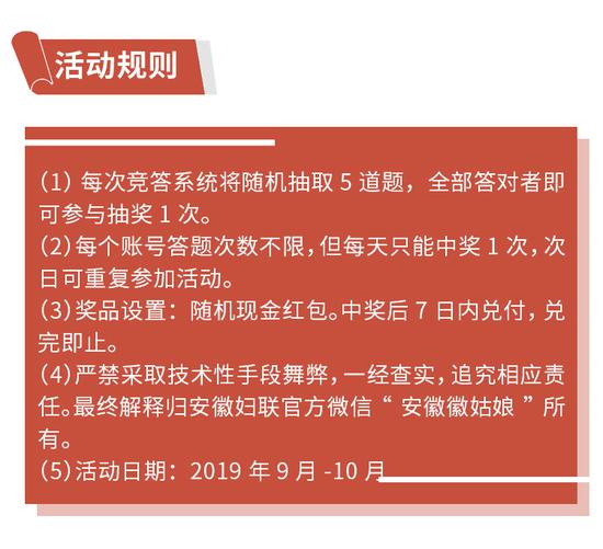 据介绍,此次活动将在9月-10月开展共16期主题有奖竞答。网友可通过关注“安徽徽姑娘”微信公众号、“安徽司法”微博微信、新浪安徽官方微博,进入“有奖知识竞答”页面即可参与。答题页面将于9月5日18:00开通,每次答题数目共计5题,只要答对全部问题,就有机会抽取现金红包大奖,快来一起参与吧。