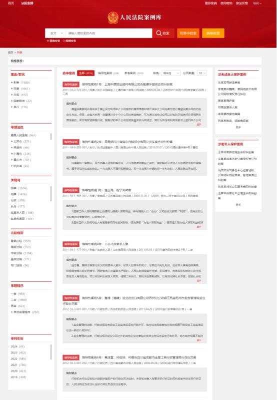 案例列表左侧提供多个筛选项,包括案由/罪名、关键词、审理法院、法院级别、审理程序、审判年份,点击筛选项,右侧列表即可加载对应的案例。