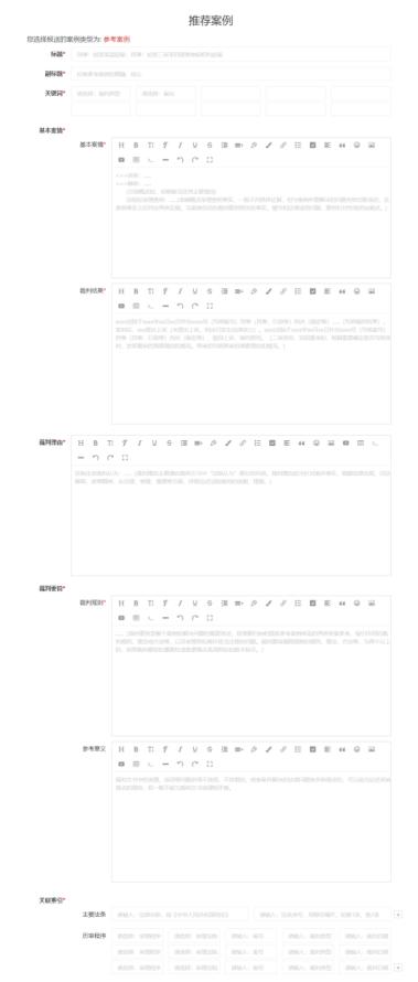 1. 标题:刑事参考案例的标题一般由被告人姓名加罪名组成,如张某盗窃案。民事、行政、国家赔偿参考案例的标题一般由案件当事人姓名或名称加案由组成,如张三诉李四侵害商标权纠纷案,注意标题中通常为一审原告诉被告且不加审理程序。执行参考案例的标题可以由案件当事人姓名或名称加执行审查程序组成,如四川某工程公司与北川某科技公司执行监督案。