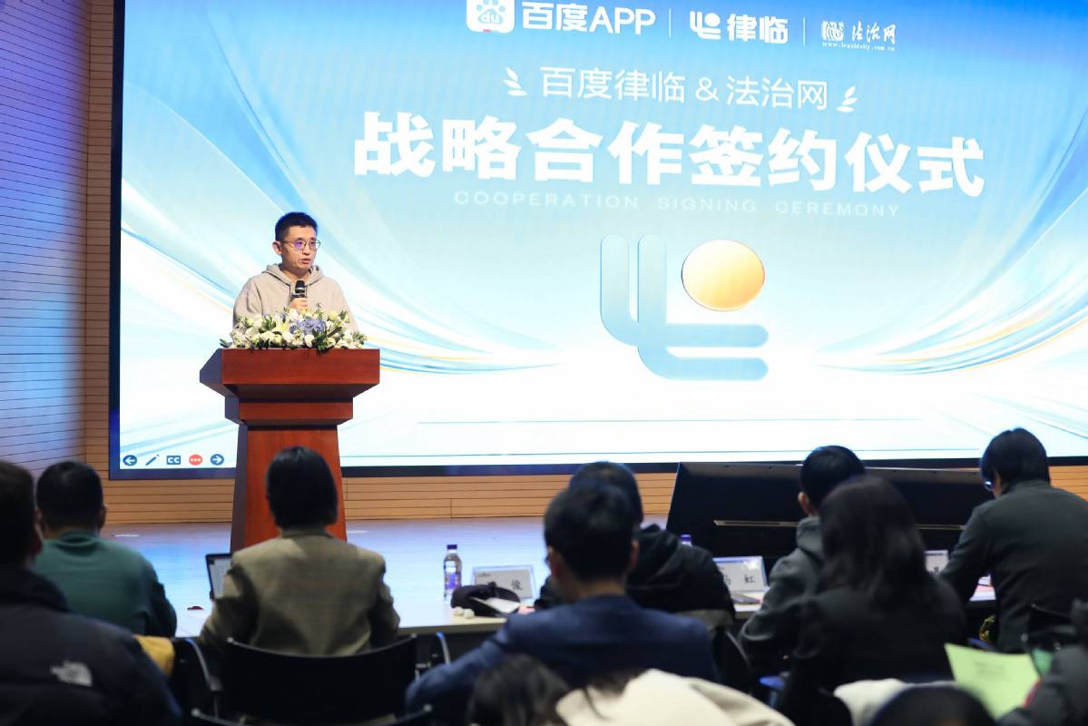 百度内容生态平台总经理宋健在致辞中表示,随着越来越多的法律人关注到互联网和互联网内容,今年百度法律垂类总流量已经达到了行业第一,百度律临作为百度法律垂类品牌,已于今年实现了从“专业法律科技平台”到“中国领先专业法律服务平台”的品牌跃升。在产品方面,律临以AI技术打造智能文书写作、智能合同审查等行业生产力工具,为法律行业赋能;在影响力方面,律临持续深化与头部律所、律协的数字化合作,为律所发展和青年律师成长助力;在普法建设方面,律临推出了“法律专家团”和《律临法典》,为网络普法以及新时代民主法治建设贡献自己的力量。宋健强调,法治网作为《法治日报》主办的综合新闻信息服务门户网站,一直以来都是国家法律信息在互联网中传播的重要窗口,也是推动全社会尊法、学法、守法、用法的核心平台。尤其在法律类互联网内容方面,法治网具备强大的号召力。相信此次和法治网的合作,将为双方在新的一年继续深耕法律行业和普法建设开个好头,让法律和互联网行业依托于内容和平台实现优势互补,以面向大众的公益普法为发力点,共同助力法治社会建设。