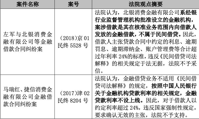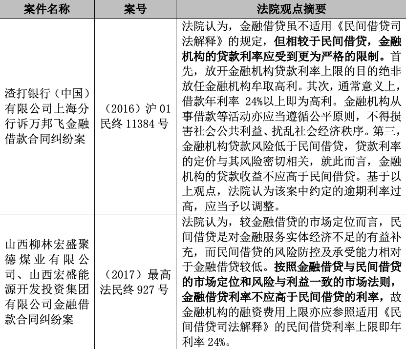 但与此同时,在更多案件中,法院观点倾向于认为虽然金融借贷并不直接适用《民间借贷司法解释》的相关规定,但相较于民间借贷,金融机构的贷款利率更应收到严格的限制,因此应当参照适用《民间借贷司法解释》规定的24%年利率上限。我们同样举以下两个案例供参考: