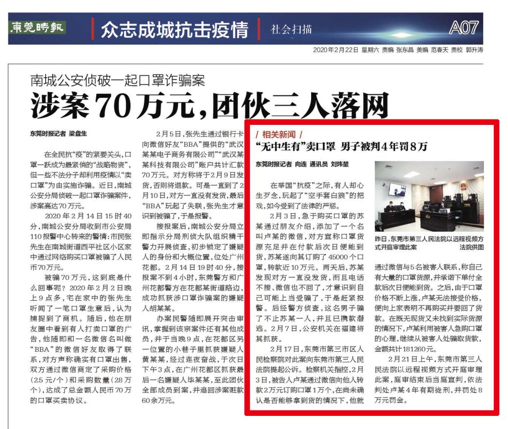 2020年2月21日,我院通过远程视频开庭审理并当庭宣判一起网络贩卖口罩诈骗案,对被告人卢某新判处有期徒刑4年,并处罚金人民币8万元。