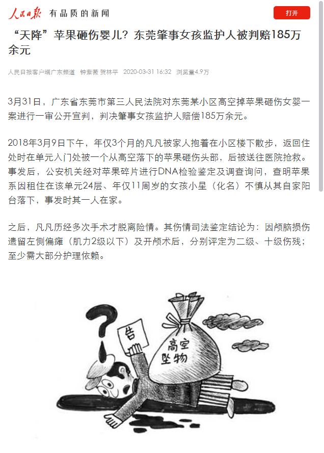 2020年3月31日上午,我院对备受社会关注的东莞塘厦镇某小区高空掉苹果砸伤女婴一案进行在线宣判,一审判决肇事女孩监护人赔偿185万余元。