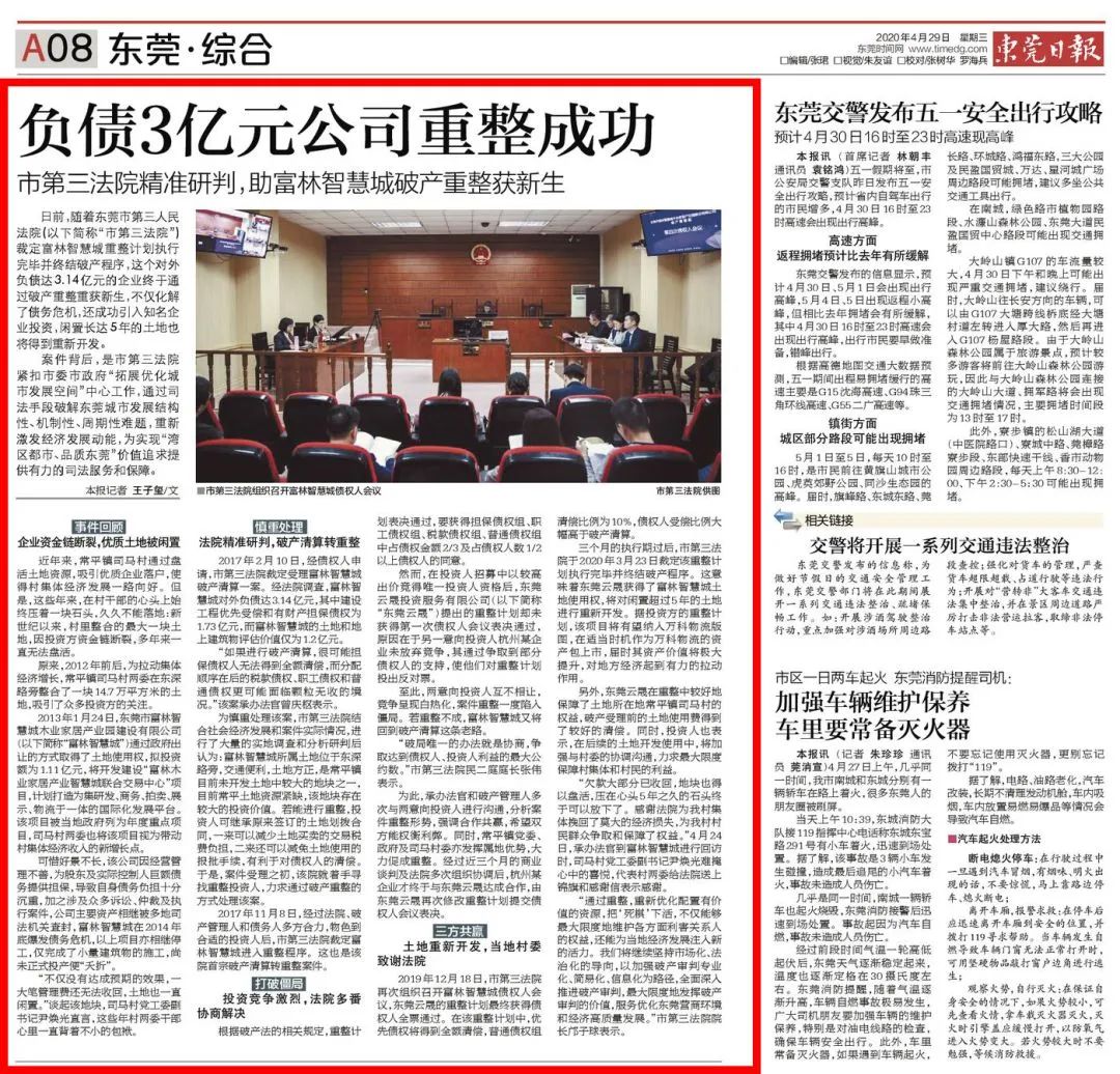 2020年4月,我院裁定富林智慧城重整计划执行完毕并终结破产程序,宣告负债达3.14亿元的企业通过破产重整重获新生。
