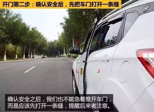 确认安全后,先把车门打开一条缝,提醒后来者注意,提前避让。