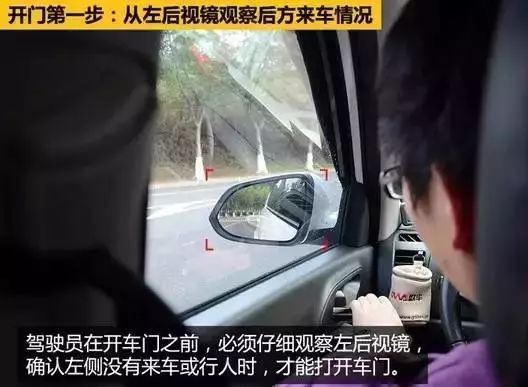 从左后视镜观察后方来车情况,确认左侧没有来车或行人时,才能打开车门。
