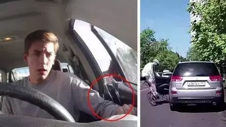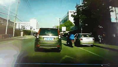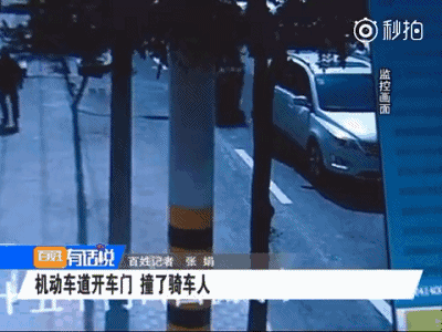 浙江嘉兴的一位司机开车行经路口时,突然靠边停车,随后一把打开车门,这时一直跟在车辆后面的电动车因避让不及,连人带车被撞倒在地。