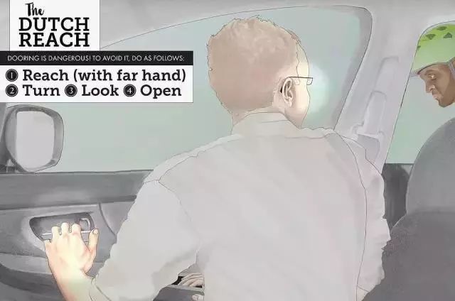 所谓“荷式开车门”,就是下车时用距离车门较远的那只手开车门,也就是说坐在左边的用右手开车门,坐在右边的用左手开车门。