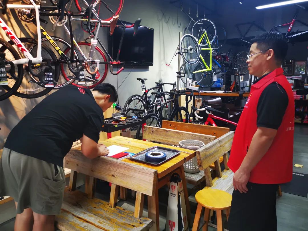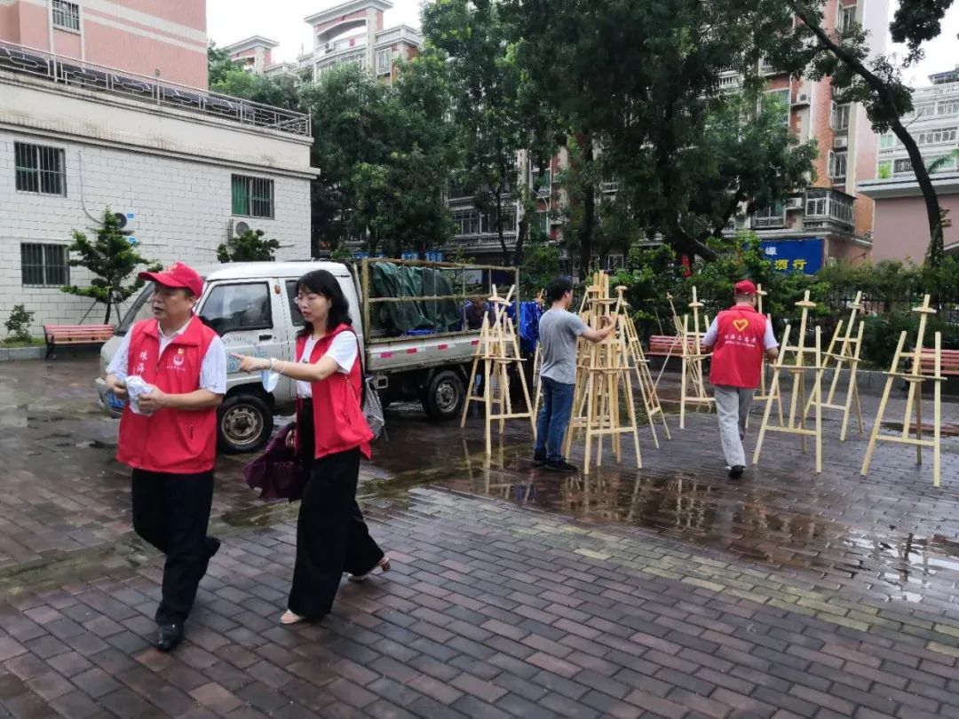 几位身着红色志愿马甲的工作人员,