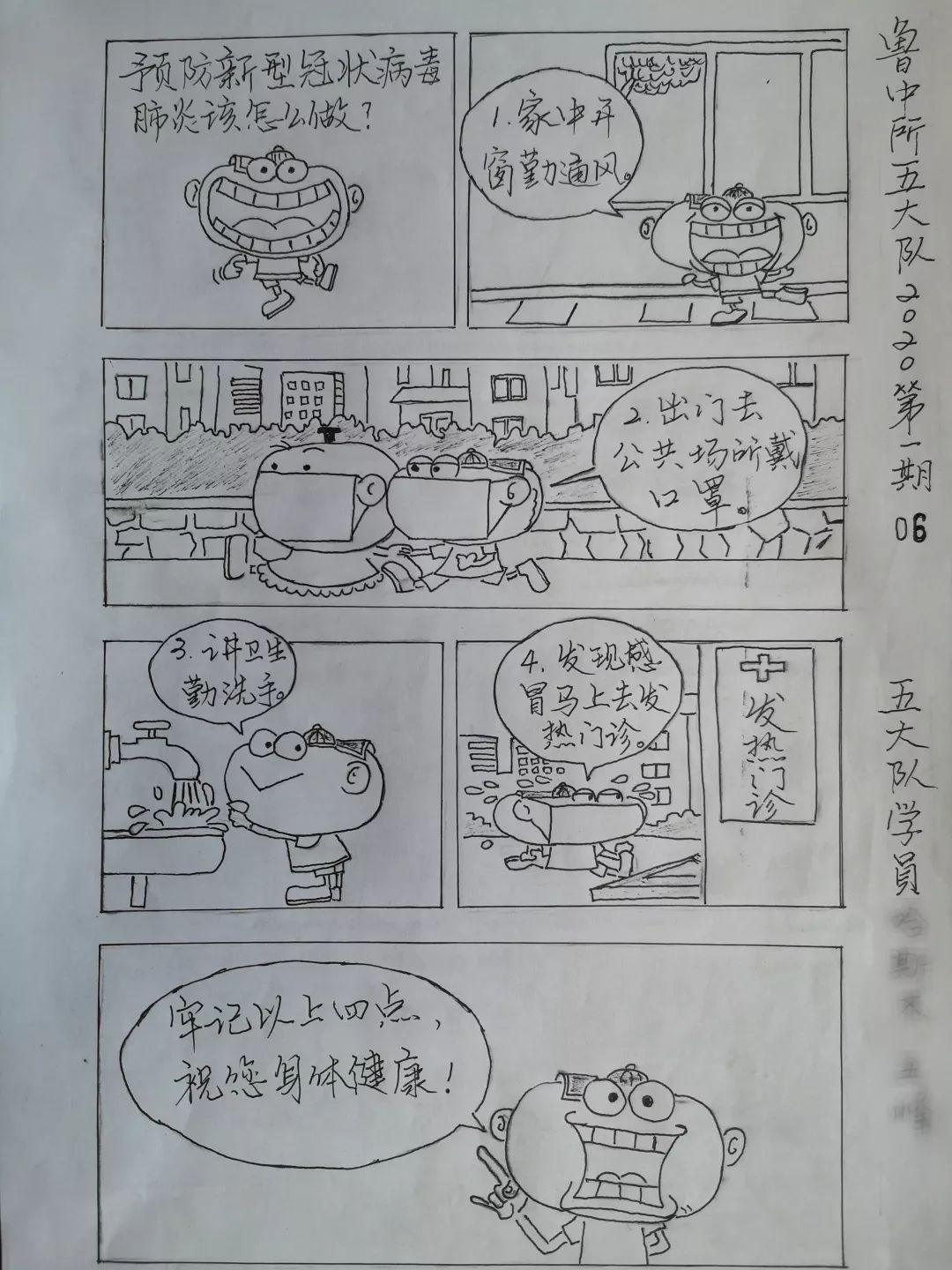 在漫画选材方面,坚持宁缺毋滥,想尽办法寻找或创作出切合疫情防控戒治生活实际的漫画素材。经过大队干警的反复创作和戒毒人员的不懈努力,在漫画初稿修改到第五遍后,第一期终于敲定。