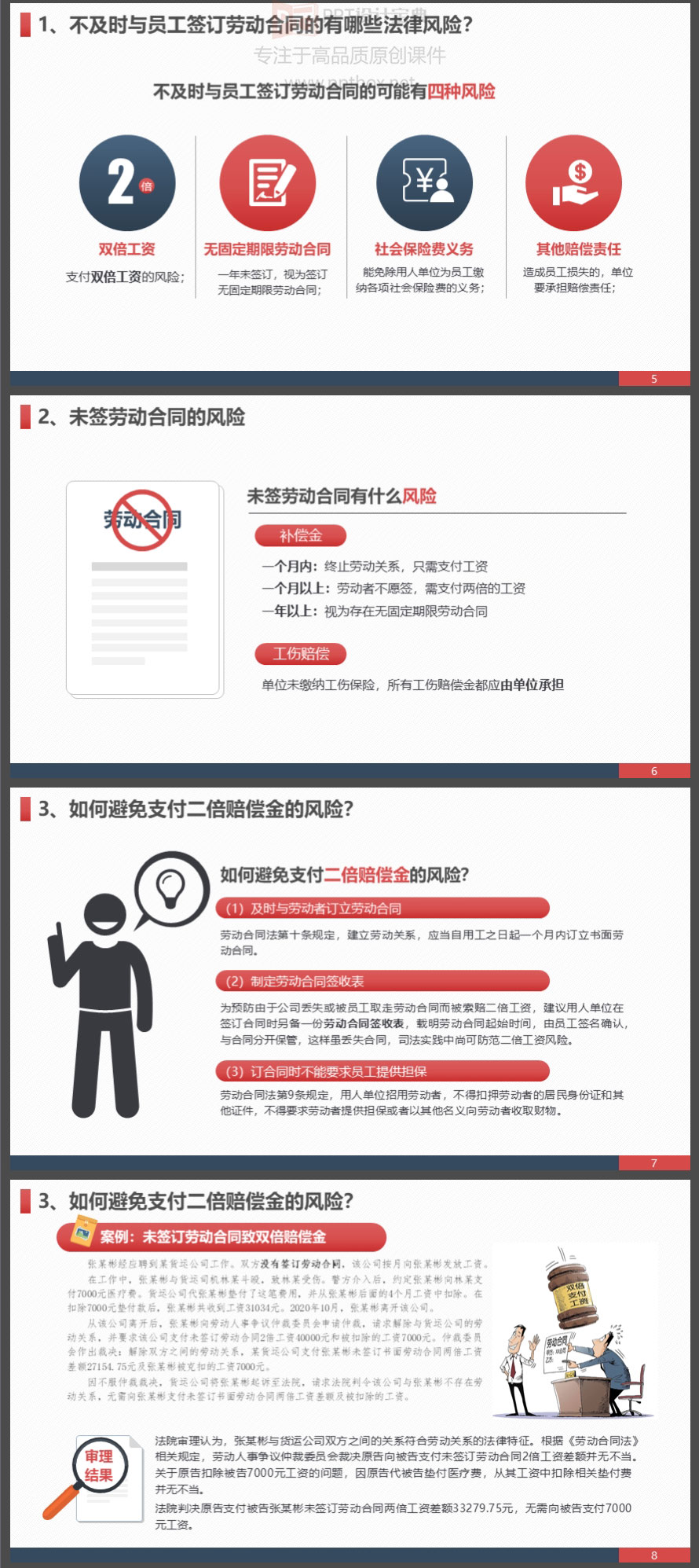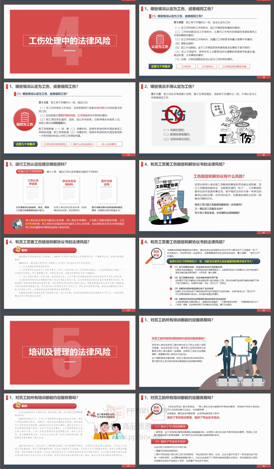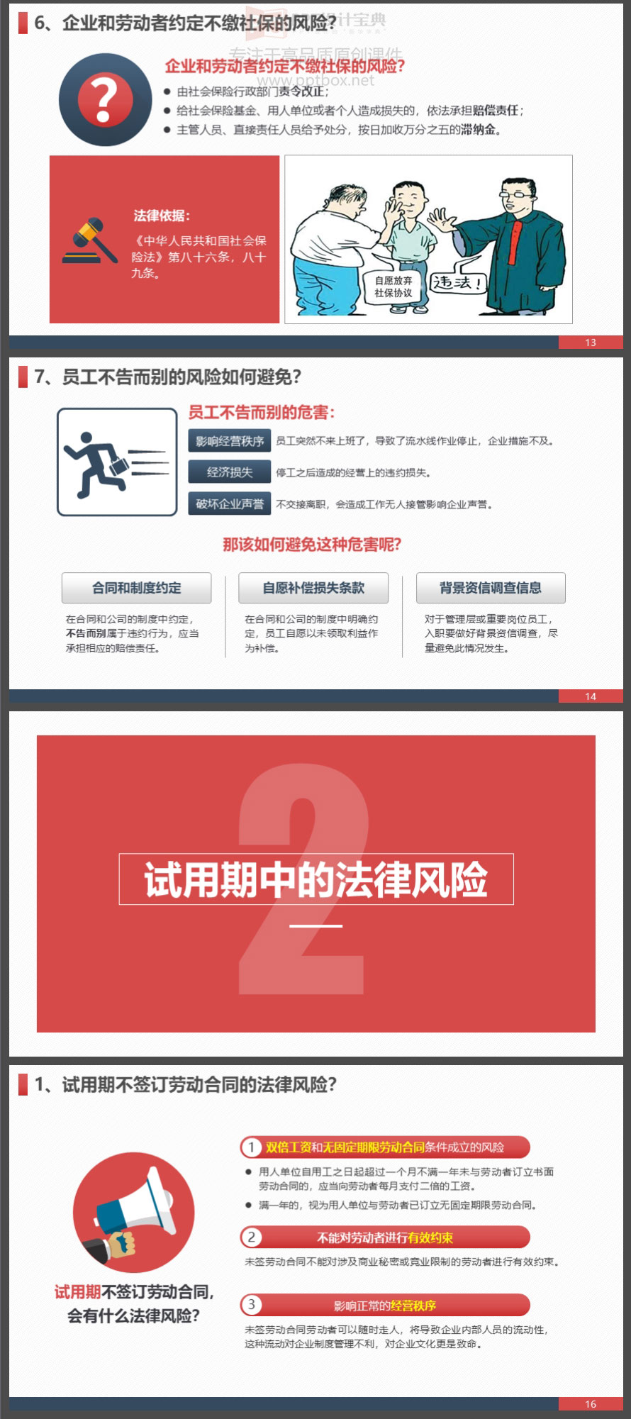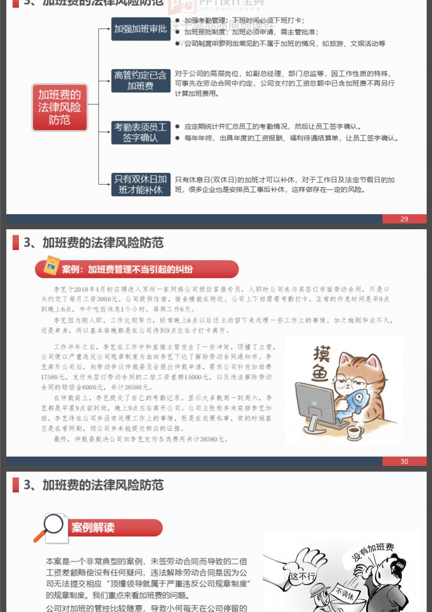 企业用工风险是指企业在招聘、雇用、管理员工过程中可能面临的各类风险。该PPT是一个关于企业如何有效识别、评估和应对用工风险的课件。通过罗列劳动合同法中的常见风险点,用分析真实案例的形式,来引出常见用工风险点及防范方法,使听众可以举一反三,自觉的关注用工各环节中可能出现的法律风险。可用于企业人事部门用于普法培训学习,或者用来作为素材和模板参考。