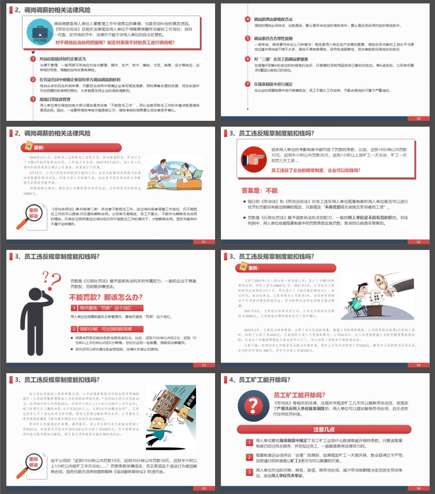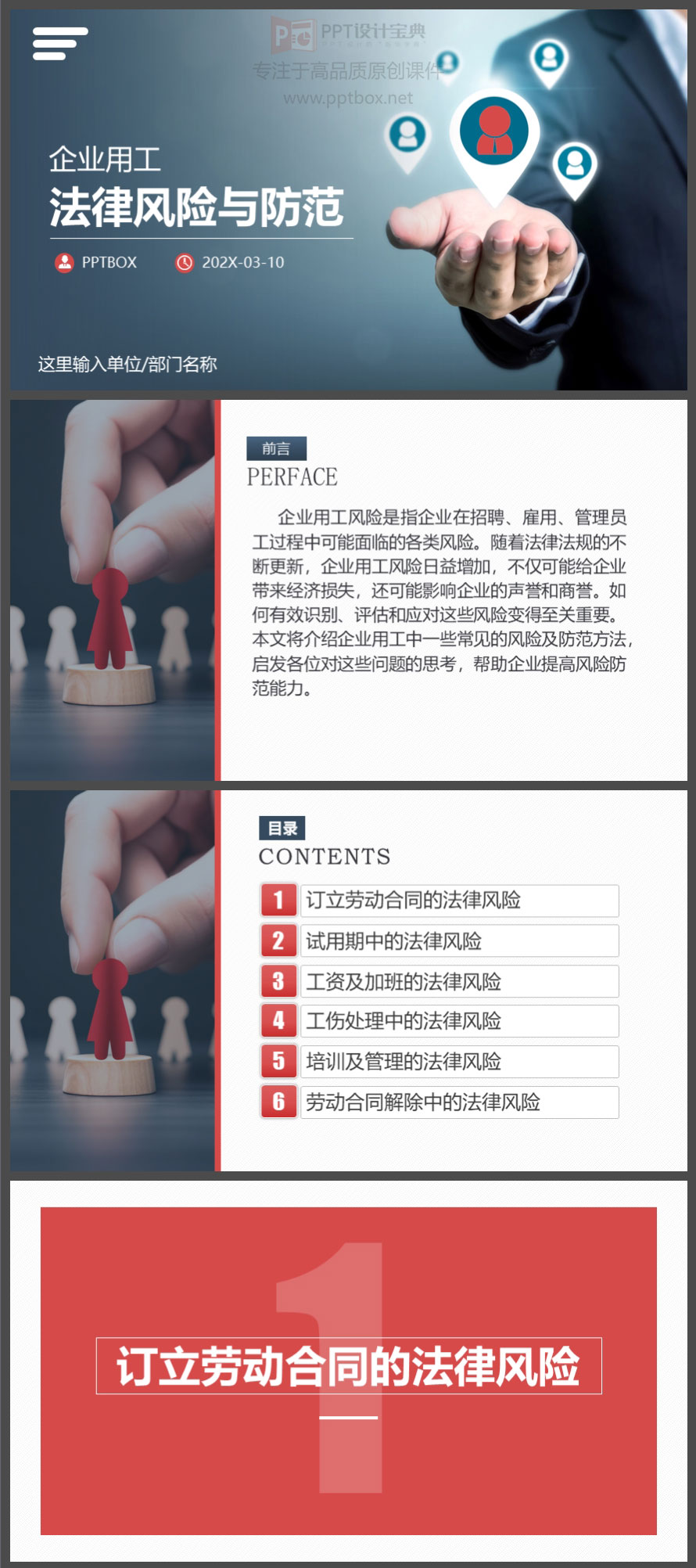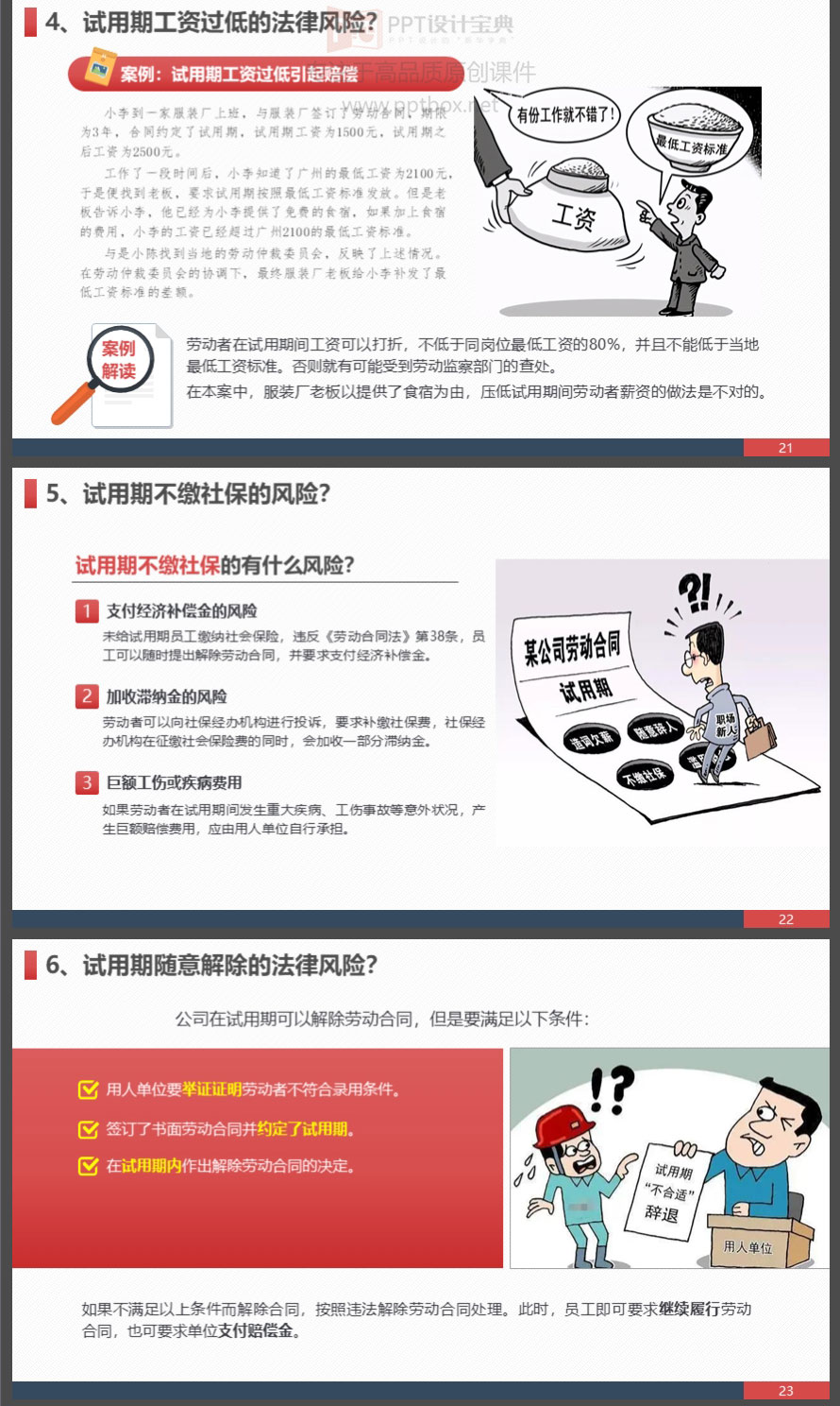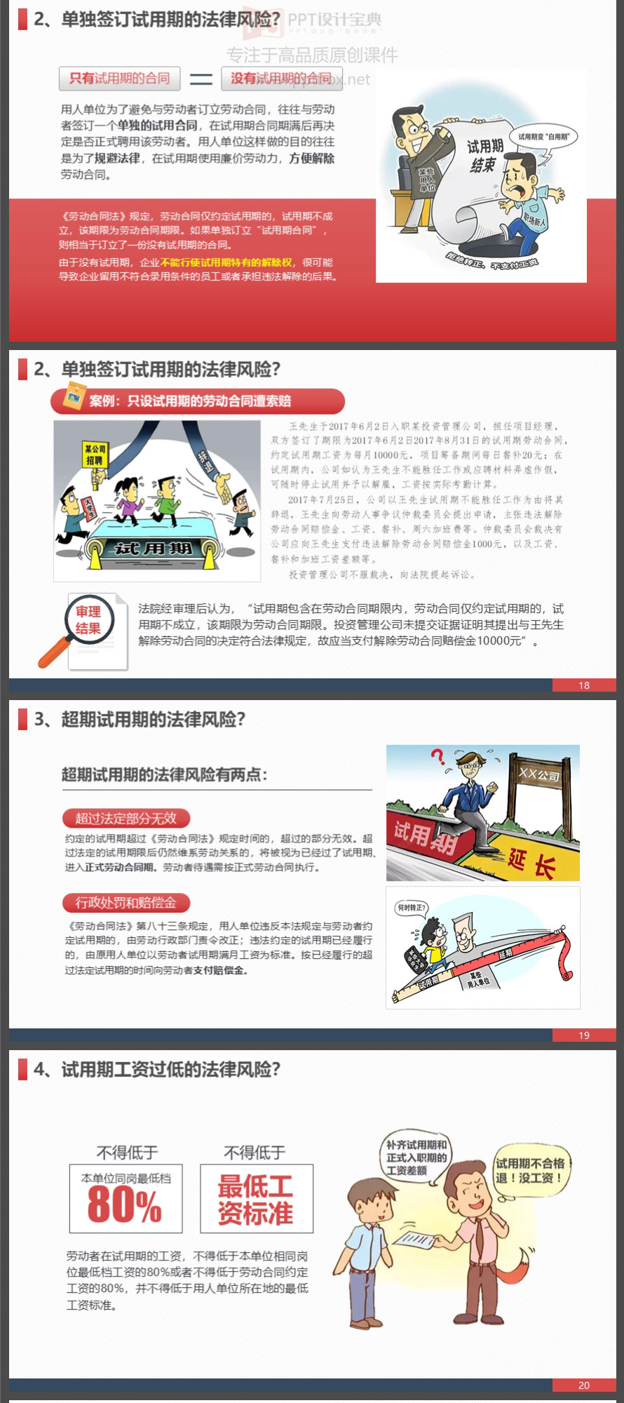 企业用工风险是指企业在招聘、雇用、管理员工过程中可能面临的各类风险。该PPT是一个关于企业如何有效识别、评估和应对用工风险的课件。通过罗列劳动合同法中的常见风险点,用分析真实案例的形式,来引出常见用工风险点及防范方法,使听众可以举一反三,自觉的关注用工各环节中可能出现的法律风险。可用于企业人事部门用于普法培训学习,或者用来作为素材和模板参考。