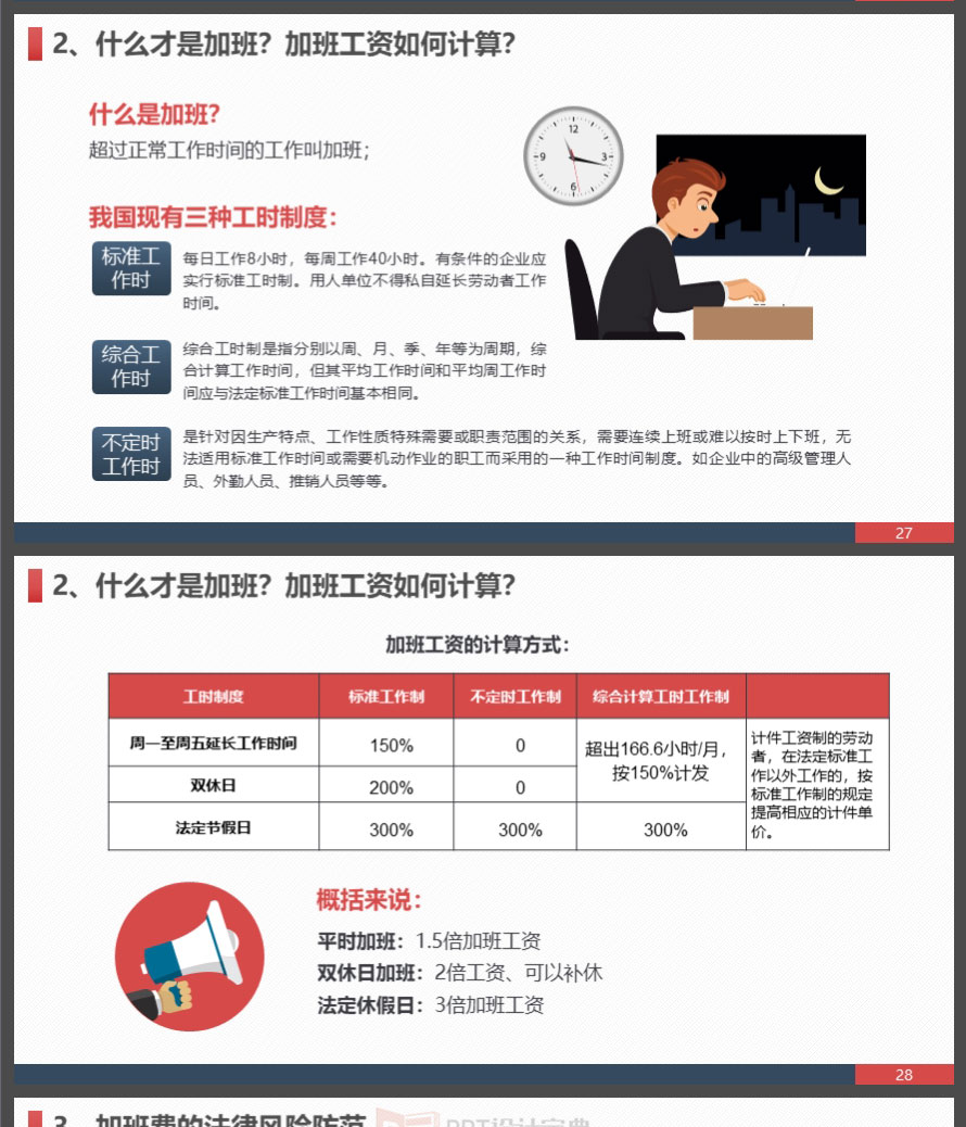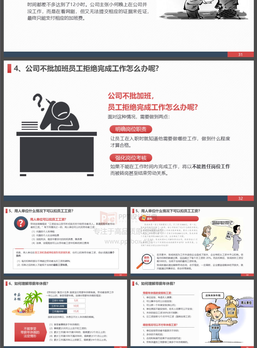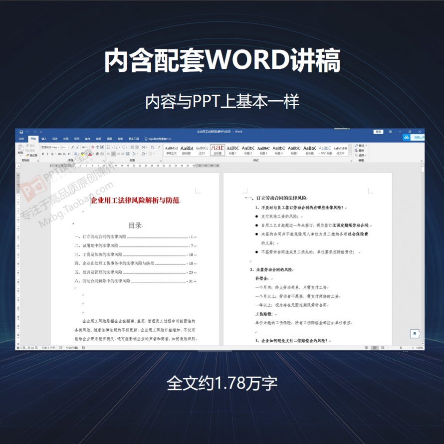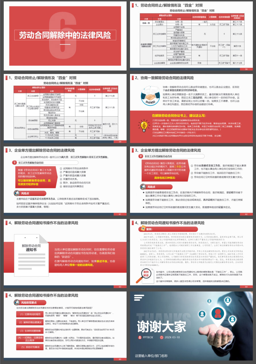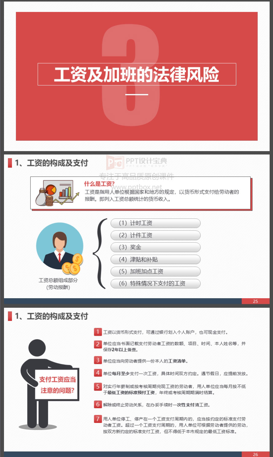 企业用工风险是指企业在招聘、雇用、管理员工过程中可能面临的各类风险。该PPT是一个关于企业如何有效识别、评估和应对用工风险的课件。通过罗列劳动合同法中的常见风险点,用分析真实案例的形式,来引出常见用工风险点及防范方法,使听众可以举一反三,自觉的关注用工各环节中可能出现的法律风险。可用于企业人事部门用于普法培训学习,或者用来作为素材和模板参考。