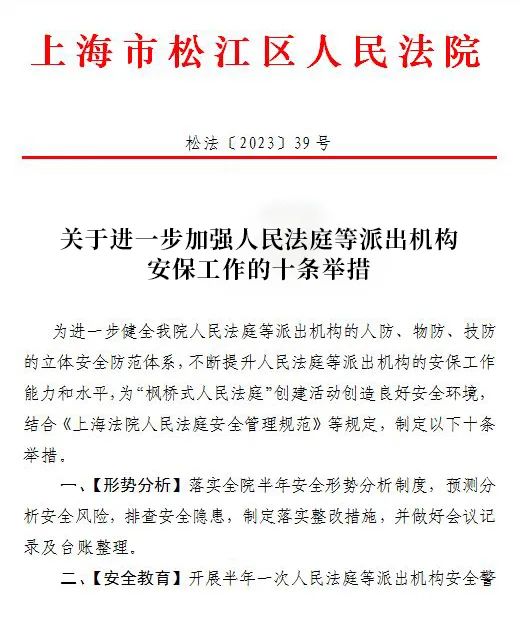 松江法院将持续加强安全警示教育,不断提升干警安全防范意识,持续加强人防、物防、技防的有机结合和实际运用,不断提升安全防范质量和效果,为维护法官权益、保障审判执行及创建“枫桥式人民法庭”营造良好安全环境。