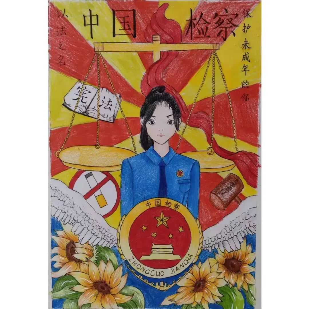 创作理念:画面中的天平代表着公平与公正,中间的检察官与检徽则组成了保障未成年人合法权益的司法保护,最下面的向日葵象征的是未成年人。我们未成年人是祖国向阳而生的花朵,被司法保护着,被国家保护着。