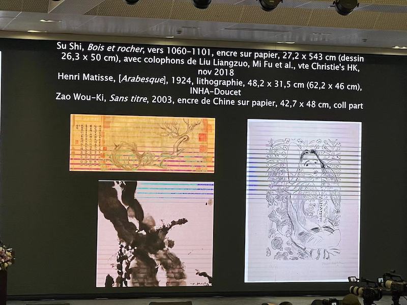德·夏西在主旨演讲中梳理了赵无极和马蒂斯艺术之间千丝万缕的关系。赵无极于20世纪30至40年代在中国创作的作品就体现了试图理解、效仿欧洲现代主义画家——尤其是塞尚、毕加索和马蒂斯作品的倾向。这一时期以及初到法国的作品均可见1920至1930年间马蒂斯作品的风格特点。但此后,马蒂斯式风格很快让位于其他更适用于其自身的视觉语言,如保罗·克利和巴黎抽象表现主义。在长达四十年的时间里,马蒂斯式风格从他的画面上消隐。同样,“中国”也在他的画面中消失直至1971年。赵无极于1949至1957年间交往的朋友圈经常与艺评家、马蒂斯的女婿乔治·杜图(Georges Duthuit)往来并受其影响。作为赵无极的亲密朋友,杜图对中国艺术也颇有兴趣,他在1936年出版《中国神秘主义与现代绘画》一书,将中国画与19至20世纪西方绘画尤其是马蒂斯的作品进行比较。马蒂斯自野兽派时期尤其是1910年初起,也对中国艺术产生兴趣。1980年代,赵无极创作了至少三件向马蒂斯致敬的作品,这不仅是向马蒂斯致敬,也是向中国艺术致敬。