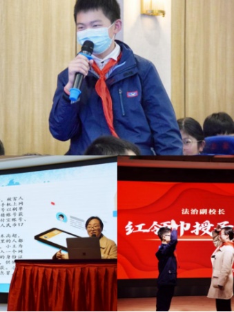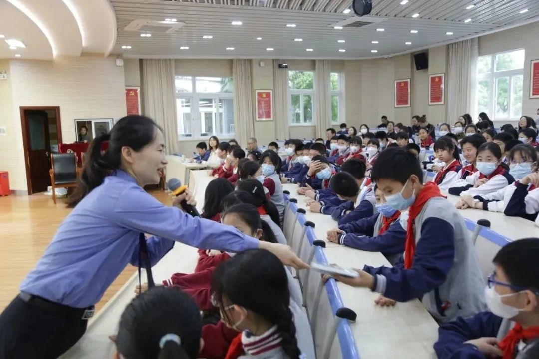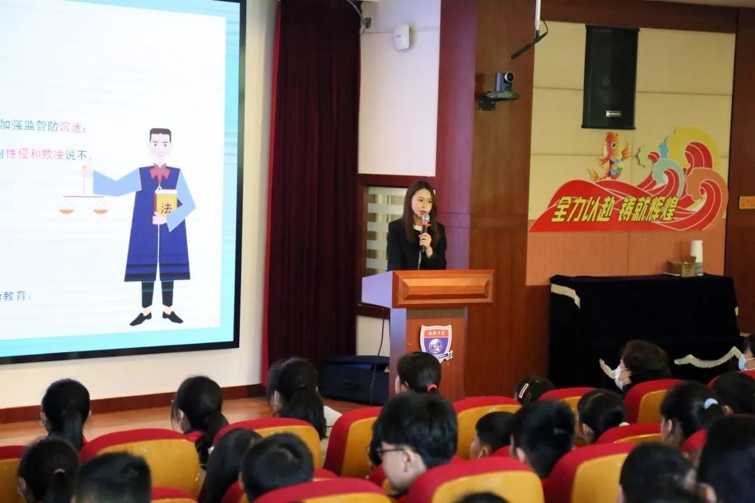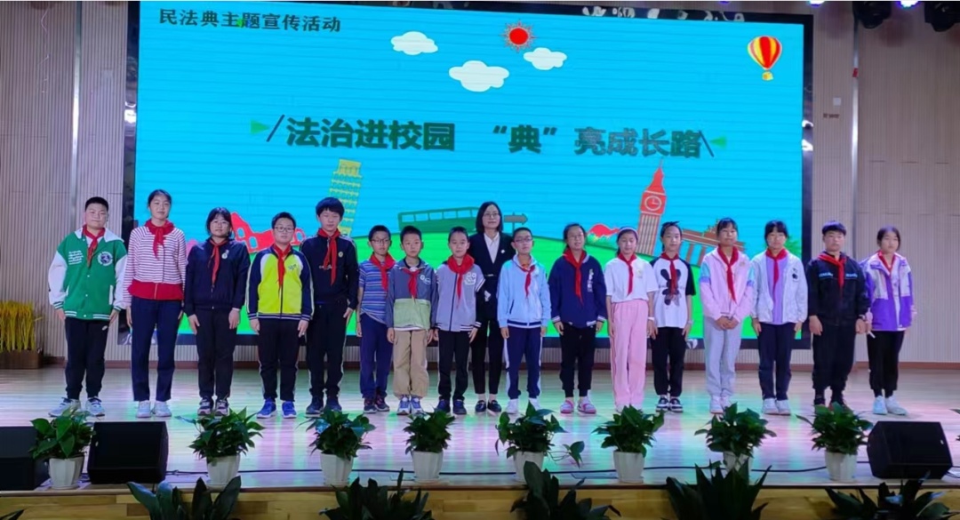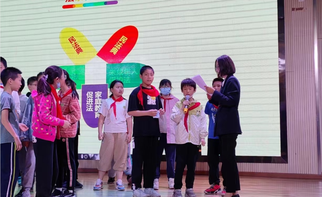 金山区第一实验小学法治副校长陆晓圆为五年级全体师生开展“法治进校园,典亮成长路”主题普法宣传,活动通过法条传声筒、法治标识大家猜、法治节日普及等互动游戏普及民法典相关法律知识,帮助学生树立法治意识。