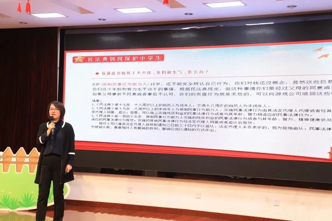 海棠小学法治副校长吴伟利以“学习民法典 做遵纪守法小公民”为主题,通过“什么是法”“什么是民法典”“民法典如何保护小学生”三个部分,以具体形象的案例、简洁易懂的语言将民法典知识和精神带进校园,还介绍了中国古代传说中的神兽——“獬豸”(xiè zhì),据说它能辨别曲直,在审理案件时,它会用角去触理屈的人。她还通过法律知识小测试,帮助全校师生再次回顾了民法典知识。