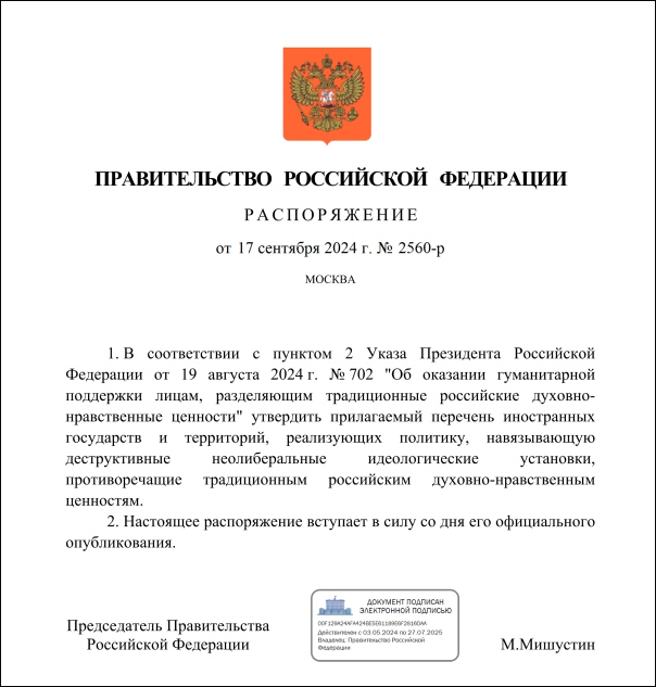 据俄新社20日报道,俄罗斯总统普京此前指示外交部确定一份“奉行与俄罗斯传统价值观相矛盾的新自由主义价值观政策的国家地区名单”。俄罗斯总理米舒斯京17日批准了这份名单,相关文件20日已在官方法律信息网站上公布。