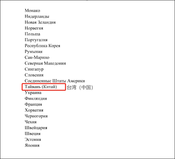 名单在“台湾”处特别加了括号,里面写有“中国”。台湾“联合新闻网”注意到了这一细节,并提到俄罗斯官方政策认定台湾是中国的一部分。