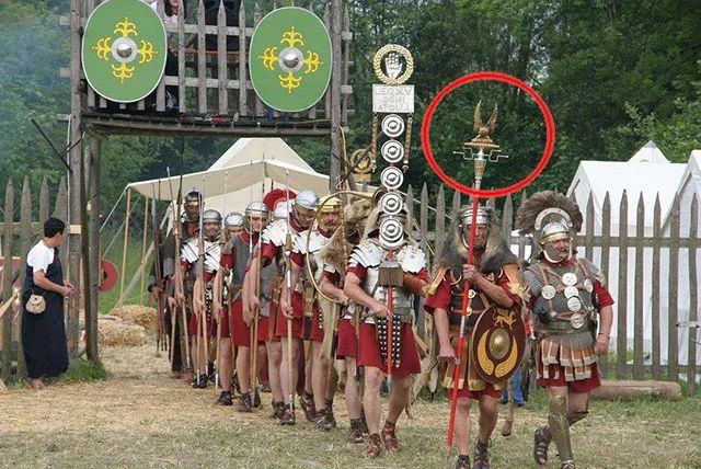 罗马军团的鹰徽是一只展开双翅抓着闪电的黑色单头鹰,被制成立体徽章安放在旗杆顶端,战士们会用生命来守卫鹰徽。