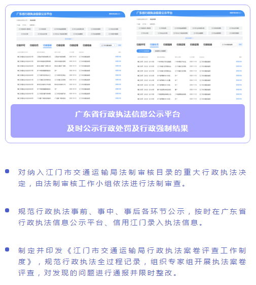 制定《江门市交通运输局行政执法公示工作制度》《江门市交通运输局行政执法全过程记录工作制度》及《江门市交通运输局重大行政执法决定法制审核工作制度》,严格规范文明执法。