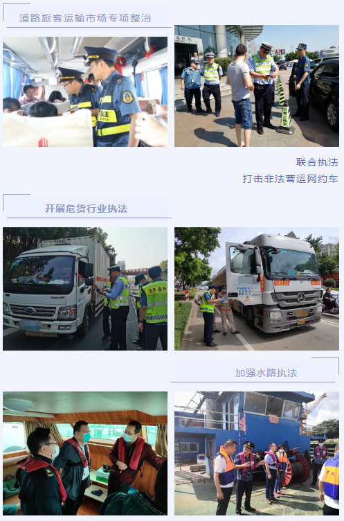 持续开展“两客一危”运输市场整治;创新水路交通执法监管思路,首次与海事、航道部门建立水路交通执法业务协作机制;全力推动公路路域环境整治;启动违反基建程序2宗案件查处,实现工程质量监管执法零破局。今年以来,出动执法人员9841人次、查处交通运输违法案件3166宗,全市无发生一起公路“三乱”行为,无有效投诉、复议和诉讼。