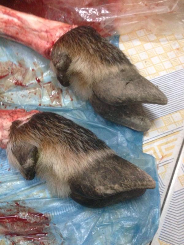 18日,赵某在田里发现又抓到了一头奇怪的动物。三人经辨认,发现它长着鹿角、羊头、牛蹄、驴尾,和在电视剧《封神榜》里看到过的神兽“四不像”很像。次日,他们将“四不像”拉到南田镇菜市场,现场分解,以40元一斤的价格叫卖。