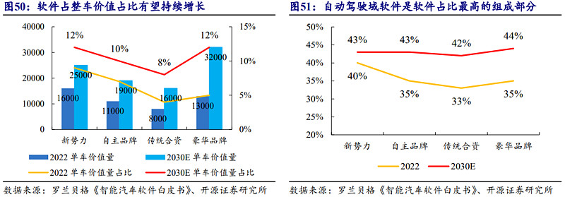 软件付费模式将逐渐替代硬件付费模式,成为汽车盈利的新可能。长久以来,汽车的盈利模式是“硬件付费”,销售与维修保养是行业的主要盈利手段,在这种模式下,通过规模化生产降低成本、通过品牌溢价维持更高的价格是获取利润最主要的思路,但这一趋势目前正在被逐渐打破。从用户角度看,互联网思维渗透进生活的各个角落,正改变着消费者对价值的理解,消费者开始愿意为服务、知识、软件付费。从技术层面看,当前汽车的电子电气架构正从分布式向域集中演变,推动汽车软硬件解耦的发生,底层软件与上层应用呈现松耦合特点,软件架构向服务导向转变。这为汽车盈利模式转向“软件付费”提供了土壤,硬件的潜在价值是为软件提供同类用户场景下的唯一入口,为软件盈利打开更大的发展空间,车企也可能会试探性地以持平BOM成本的低价出售汽车。根据罗兰贝格数据,预计到2030年,综合考虑不同品牌类型的典型车型,单车软件价值将增长至16000-32000元,其价值占BOM的比例将增加至8-12%。而自动驾驶是搭载于汽车之上的软件产品,或将成为汽车软件盈利的主要方面。