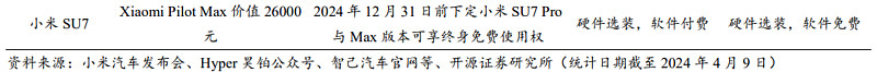 (2)硬件选装,软件付费:有不同版本的车型/选装配置,在其他条件相同的情况下,带有城市NOA功能的版本/选装配置有更高的售价,且只有选择这种版本/选装配置才能够再选择付费开通城市NOA。城市NOA为代表的高阶自动驾驶现在有两重定位,第一是作为整车一部分的功能,第二是作为附加的独立产品,这种使消费者付费两次的方案就属于后一种定位。硬件选装+软件付费的方案,一方面出于提升销量的考虑,照顾不需要智驾的用户,为消费者提供更多样的选择;另一方面是尽可能将成本分担于消费者,来保持自动驾驶盈利能力,在第一次付费时筛选智驾用户,在二次付费时对智驾用户进行持久的价值获取。采用这种方案的典型车型有问界全系、智界S7、智己LS7、极狐阿尔法SHI、腾势N7、昊铂GT、小米SU7等。