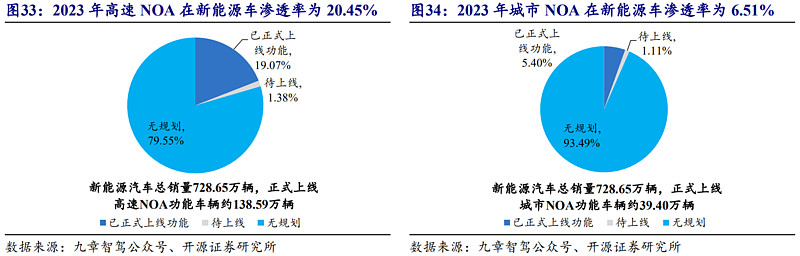 更广的覆盖率意味着能够触达更广的人群,进而产生扩散效应。自动驾驶要进入主流市场,必须要有广泛的覆盖率,因为主流市场的用户仍不清楚自动驾驶对他们的价值有多大,拥有浓厚的观望情绪,所以必须有参考的对象。马尔科姆·格拉德维尔在《引爆点》一书中提到,1984年到1987年,夏普低价传真机的销量在美国一直都是缓慢上升,而直到1987年,拥有传真机的人数已经多到足以让每个人都觉得自己应该拥有一台传真机,传真机销量在这一年突飞猛进,一共有100万台传真机售出,而在三年前年销量仅有8万台。根据九章智驾数据,2023年新能源乘用车中标配L2功能车型的渗透率达到了50.56%,同比提升7个百分点左右,而新能源乘用车中搭载高速NOA/城市NOA功能车型的渗透率分别达到了20.45%与6.51%,考虑到2023年我国新能源车渗透率为31.6%,自动驾驶的渗透率仍有待提高,自驾能力领先的车企也将城市领航辅助的开城视为当前阶段的主要目标。