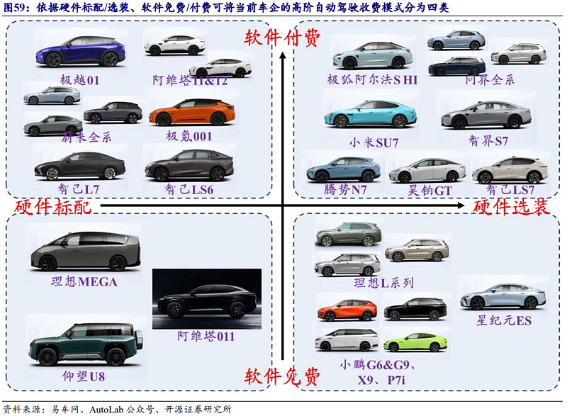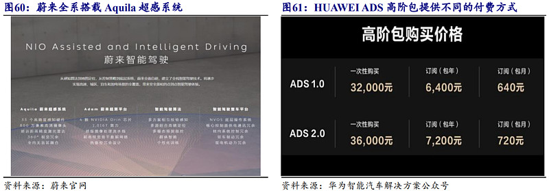 (1)硬件标配、软件付费:车型全系标配能够实现城市NOA的硬件,硬件成本包含在车的售价中且消费者无法选择,同时使用城市NOA功能需要单独为付费。硬件标配的方案一般存在两种情况,第一种是全套硬件成本较低,包含进车辆售价中观感不强;第二种是车辆定位较高,用户对价格不敏感,将全套硬件包含进车辆售价中对消费者决策影响不大。采用这种方案的国内典型车型有蔚来全系、极越01、阿维塔11&12、极氪001、智己LS6&L7等。