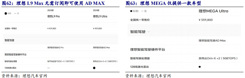 (3)硬件选装、软件免费:车型中有不同版本或选装配置,在加价选购带有城市NOA的车型后,不需要为使用城市NOA功能单独付费,这实际上是对整体智驾方案的打包售卖,成本已经包含在车辆的售价中。选装+一次打包售卖的方式兼顾产品多样性与消费者的情绪,同时形成较高的智能软件装载率,不仅带动品牌口碑与销量,塑造品牌形象,还能收集更多数据打造数据闭环。但是高昂的研发成本与软硬件成本会进入车的价格之中。采用这种方案的国内典型车型有理想L系列、小鹏P7i&G6&G9&X9、星纪元ES等。