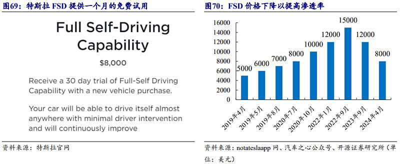 FSD提供买断与订阅两种模式,特斯拉提高买断门槛来培育大众订阅习惯。在标配的硬件基础上,消费者可以选择买断或者订阅FSD,当前来看,北美FSD买断价格为8000美元,订阅价格为99美元/月(此前为199美元/月),且规定FSD在功能开通后跟车不跟人,用户在A车上开通的FSD功能不可以在B车上使用。尽管特斯拉后续推出限时免费转移FSD功能的措施,但考虑到车辆使用与寿命增换购需求,这一规定会损害部分消费者的买断热情,从而鼓励愿意购买的用户采用订阅的模式。FSD的高昂售价也会促使愿意体验的消费者采用订阅模式,当前一辆后驱版的ModelY的价格为42990美元,而买断FSD的花费占到车价将近20%,设置的高门槛会劝退买断的想法,而将愿意选择FSD的用户导向订阅。特斯拉过去连续上调FSD的价格,最高至15000美元,后为增加普及率才会降价。2023年3月,马斯克宣布美国用户可免费试用FSD一个月,并要求北美销售包括FSD试驾,以提高用户对FSD的认识和采用,以增加自动驾驶收入。