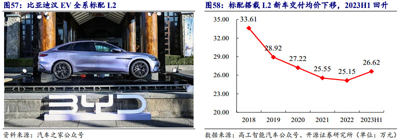 技术扩散与产业链成熟促使L2功能的成本快速下降,得以搭载于价格区间更低的车型,根据高工智能汽车数据,搭载L2(含以上)功能的车型,其交付均价已经由2018年的33.61万元下探到了2022年的25.15万元。在自动驾驶成为竞争战场的当下,L2功能成为车企难以忽视的智能化标签,车企也愿意使更多的车型搭载L2功能以增加卖点。车企多采用软硬捆绑方案,即L2功能的价格包含在车价中,购车后无需单独付费开通L2软件功能,但同一个车型中可能存在全部或部分标配L2的情况,正如同时提供自动挡与手动挡选择的车型。尽管L2功能的成本在下降,但是软件与硬件的成本并不为0,可以发现在2023年上半年,搭载L2(含以上)功能的车型的交付均价回升至26.62万元,一定程度反映出在价格战愈发激烈的市场环境中,价格敏感的中低端车型会对L2功能进行更多的选装以获取更强竞争力。