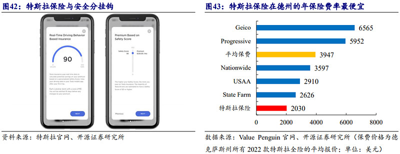 车险是消费者在购买电动车之后的最大消费,成本在5000-10000元/年。在安全分的评定中,使用Autopilot(包括EAP与FSD)行驶的里程会包含在里程总数中,但是在Autopilot运行期间发生的事件不会计入安全分数,这意味着使用特斯拉自动驾驶功能越多,安全分达到较高的分数的概率越大。而安全得分高的特斯拉驾驶员可以在购买特斯拉保险时节省更多费用,100分可以比90分节省37%,这会激励特斯拉车主在能够使用自动驾驶的地方去更多使用自动驾驶。根据Value Penguin的数据,2022年,特斯拉保险在德克萨斯州为特斯拉新车投保的平均费率为2030美元/年,比平均水平低49%,为用户提供了切实的优惠,反过来也会促进用户对FSD功能的需求。