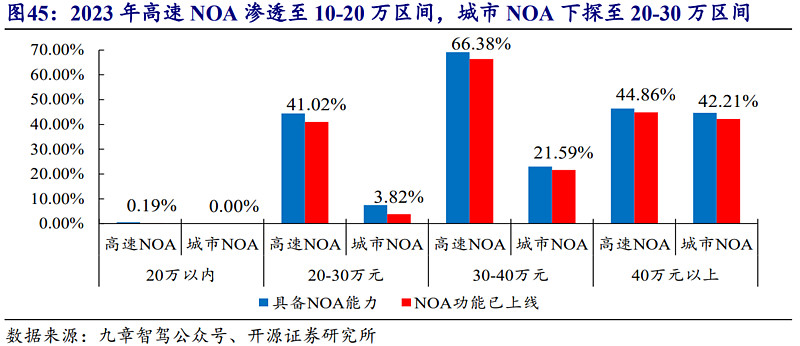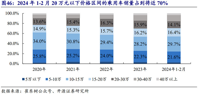 自动驾驶的角逐渗透至20万元以下乘用车市场。早期大众多是实用主义者,其最重要的特点是希望看到竞争,其中一个原因是为了降低购买成本,因而对价格相当敏感。自动驾驶技术想要普及仍有很长的降本工作,包括整体方案成本的降低、搭载到价位更低的车型、更低的维护费用等等。从导航电子地图与自动挡的经验来看,其普及的契机都是价格低到消费者觉得可以接受,这也符合实用主义者的特征。随着技术路线的明晰与产业链的逐渐成熟,目前高阶自动驾驶功能的价格区间正在不断下探,2023年的新能源车中,高速NOA功能已经渗透至10-20万区间,城市NOA功能也已经下探至20-30万区间。根据中国乘用车市场的价格结构来看,2024年1-2月20万元以下价格区间的乘用车零售销量占到总销量达到70.5%,高阶智驾功能仍有广阔的渗透空间。