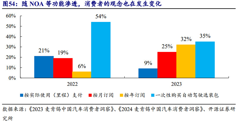 消费者对一次性买断的意愿更高,同时愿意采用按年订阅的用户迅速增长。市场并未有真正意义上免费的高阶自动驾驶,消费者仍旧需要对功能进行付费,方式包括买断与订阅。买断是一次性付费以获得永久使用权,订阅是定期(通常是按月或按年)支付费用获得临时使用权。根据麦肯锡的调查数据,消费者更加偏好买断制,即使买断会有较高的单次支出,但是如果长期使用自动驾驶的话,买断平均价格相较于订阅更低;同样的原理,长期订阅相较于短期订阅会有较高单次支出与较低的平均支出,但更为实际的消费者会考虑到车辆置换的影响而选择订阅,其中更偏好简单直接的订阅方式。随着消费者群体接触与体验自动驾驶,其呈现的偏好也在变化,可以看到相比于2022年,“城市NOA”元年的2023年的消费者对买断和订阅的态度也在变化,愿意按年订阅的受访者比例同比增长26pct。