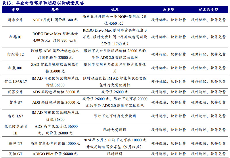车企短期以价换量,长期将回归价值,有望实现自动驾驶软件盈利。城市NOA尚未广泛渗透,对于车企来说,当前阶段使得更多的用户能够触及自动驾驶,形成用户基本盘是首要任务,培育消费者对自动驾驶的认知已经成为市场共识,因而车企在各自的城市NOA收费基础方案上都做出力度相当大的优惠活动。消费者对自动驾驶的认知还是功能层面,而看不见摸不着的软件部分具有一定的定价弹性,这使得优惠活动多是在软件上通过降价或免费的形式进行让利。以价换量的手段能够促进城市NOA快速被用户接受,但靠压缩软件部分的利润、只将自动驾驶作为整车的一个功能,又会回到“卖硬件”的传统路径,无法实现自动驾驶的商业盈利。长期来看,随着消费者与车企对自动驾驶的价值达成共识,作为产品的自动驾驶或将成为主流,在实现一定的规模后,靠“卖软件”实现自动驾驶的盈利将成为可能。
