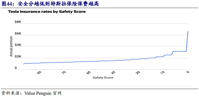 以安全分为基础,特斯拉车险做到“千人千面”。特斯拉利用实时驾驶行为提供保险,而不是其他保险公司使用的信用、年龄、性别、索赔历史和驾驶记录等传统因素。特斯拉保险会通过用户驾驶的车辆、居住地点、驾驶时间、选择的承保范围以及车辆的每月安全分等因素确定保费,当用户的驾驶越安全,其安全分就越高,保险费就越低。首次注册时,用户初始安全分为90分,安全分会根据用户上一月的驾驶行为每月变动一次;同时特斯拉车险的最低投保周期由普通车险的年变成月,可以按月为单位进行线上投保,保费也会根据车主的安全分和行驶里程进行每月调整。特斯拉这种UBI保险能够鼓励车主培养良好的驾驶习惯,做到“一车、一况、一保险”的定价策略,其价格公平化程度远高于传统车险的“产品化”定价模式。