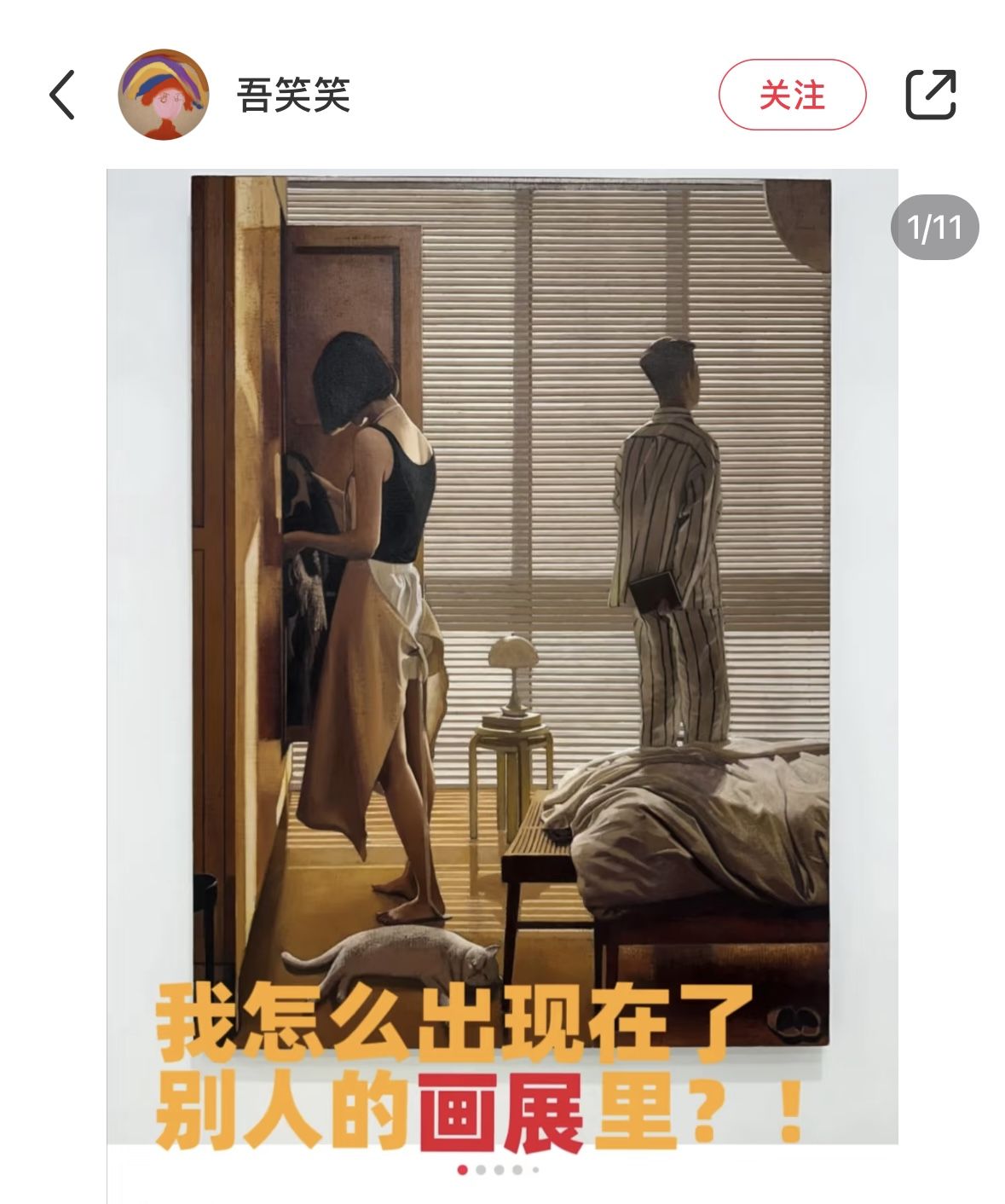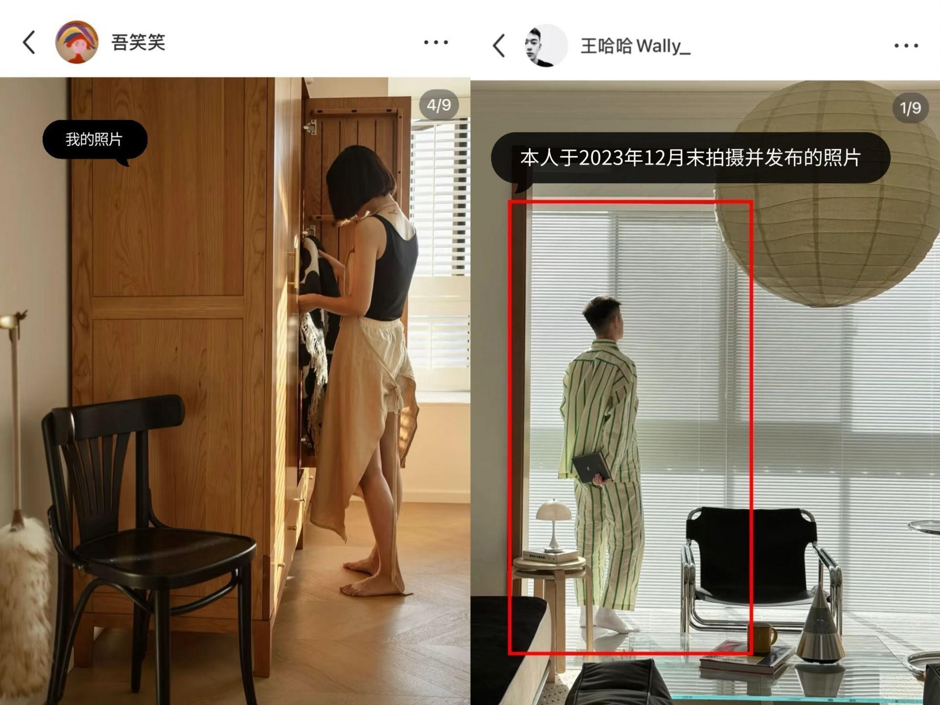 “吾笑笑”提到的“陌生男性”,其实是家居博主“王哈哈Wally_”,他也是该事件的受害者。不久前,“王哈哈Wally_”同样发现自己公开发布的照片和家居场景,几乎一比一被还原到油画上,并和“吾笑笑”的照片进行了“拼贴”。