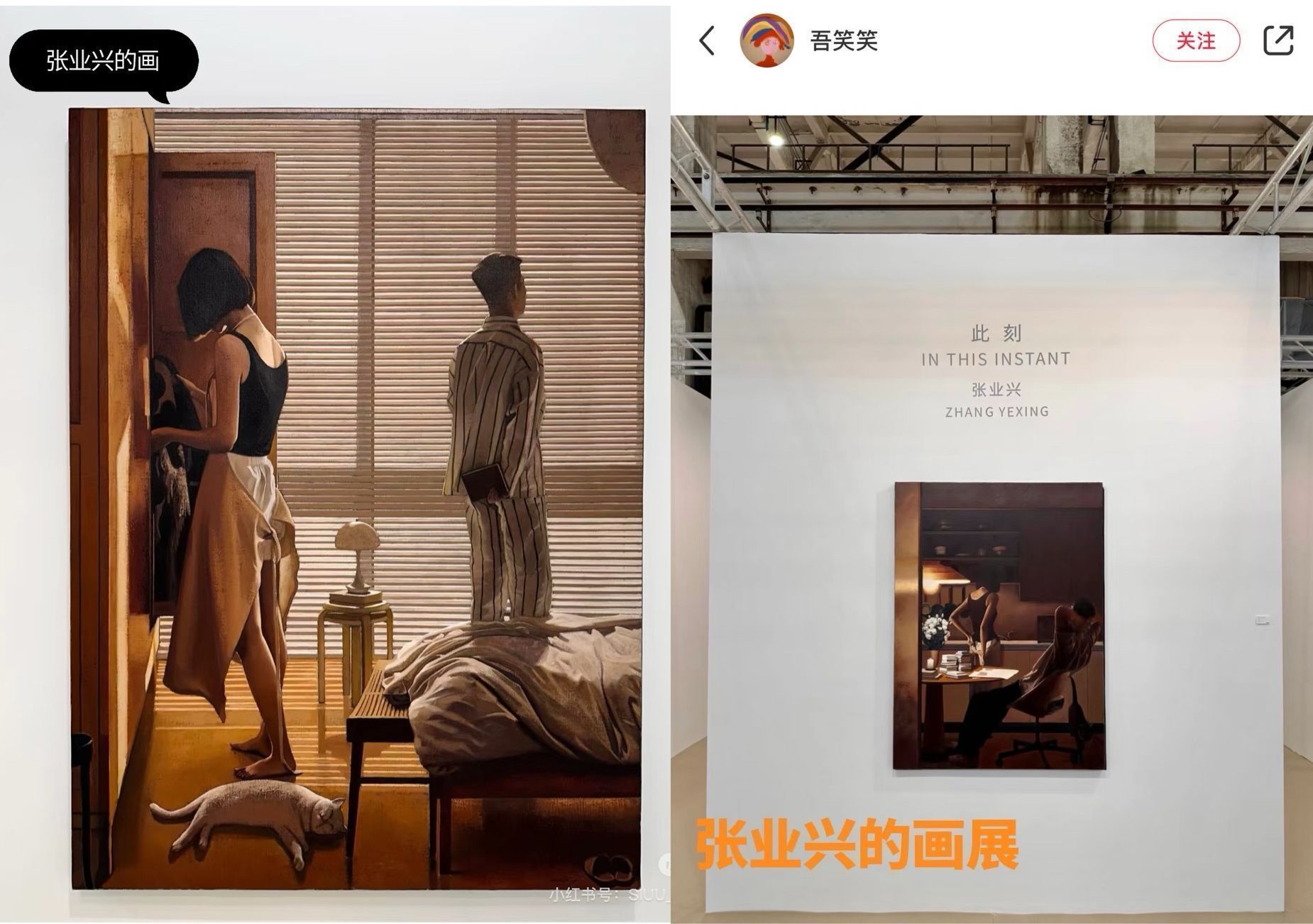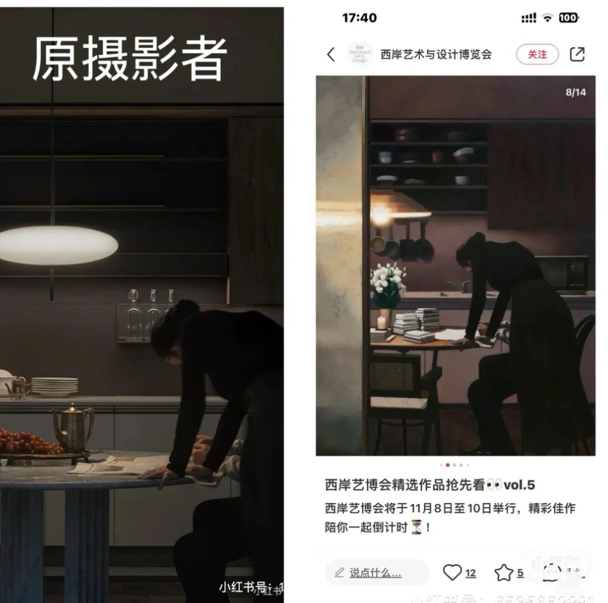 随着事件发酵,越来越多的创作者发现,自己的作品在未经授权的情况下被使用,室内摄影师覃昭量也是其中之一。11月27日,覃昭量接受读特新闻记者采访时表示,在今年11月举行的西岸艺术与设计博览会上,参展画廊站台中国当代艺术机构展出的画家张业兴个人项目《此刻》系列中,有一幅画作直接“抄袭”了他为客户拍摄的项目照片。