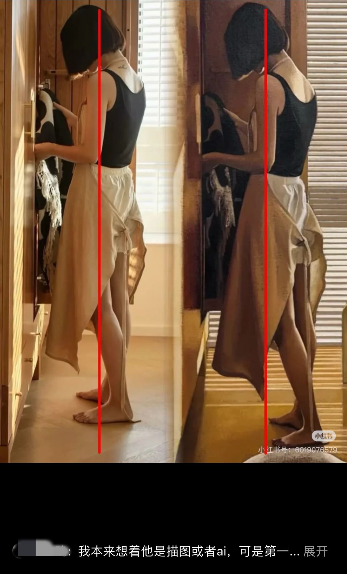 网友在社交平台讨论张业兴画作的重心和比例有调整,并非1:1复制。图源:网络
