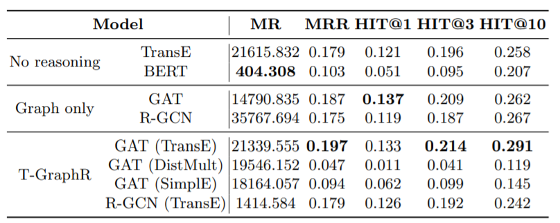 我们的T-GraphR方法取得了最好的性能,与纯文本的无推理模型TransE相比,甚至获得了12.8%的hit@10改进。