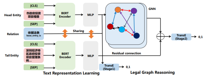 上图即为T-GraphR的架构。其中的TransE(Stage1)和TransE(Stage2)分别指文本表征学习和法律图推理。首先,我们利用预先训练好的语言模型BERT,用低维向量表示实体。然后,我们利用图神经网络(GNN),该网络同化了通用的消息传递推理算法,在法律知识图上进行法律推理。