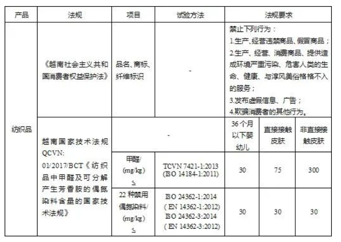 越南纺织服装技术法规为QCVN: 01/2017/BCT《纺织品中甲醛及可分解产生芳香胺的偶氮染料含量的国家技术法规》(法规颁布21/2017/TT-BCT⑪及后续修订07/2018/TT-BCT⑫、20/2018/TT-BCT⑬)。